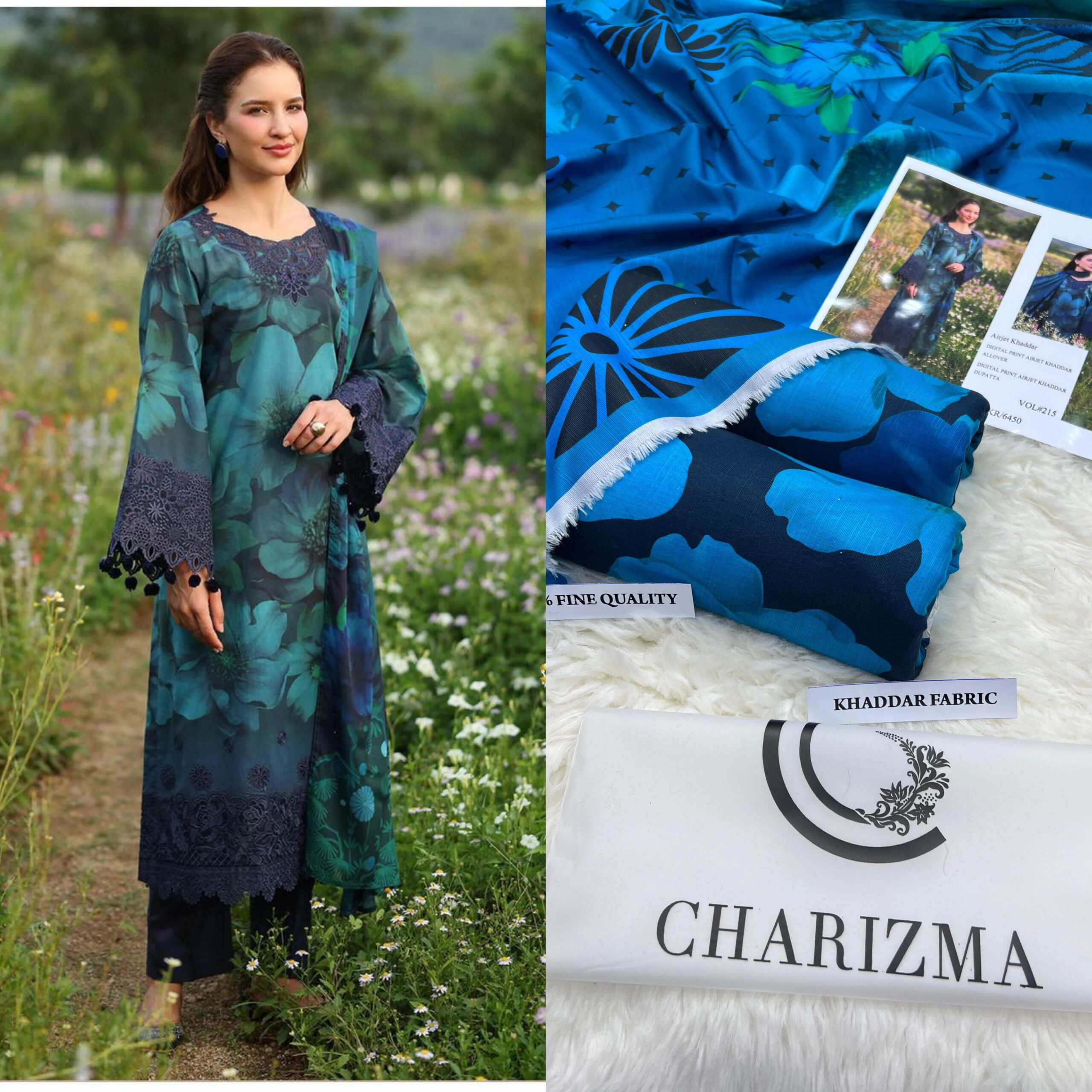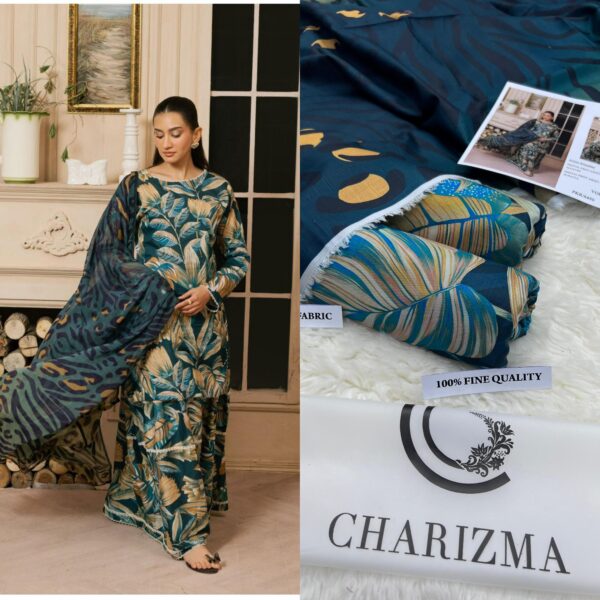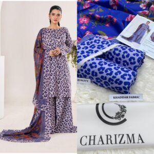 Shop premium Charizma Airjet Khaddar Digital Print 3Pc suit in fine slub fabric. 100% guaranteed fabric with front, back, sleeves & dupatta digital printed. Wholesale price only Rs. 2999. Loose designs available – 8 Ghz full suit cutting.
